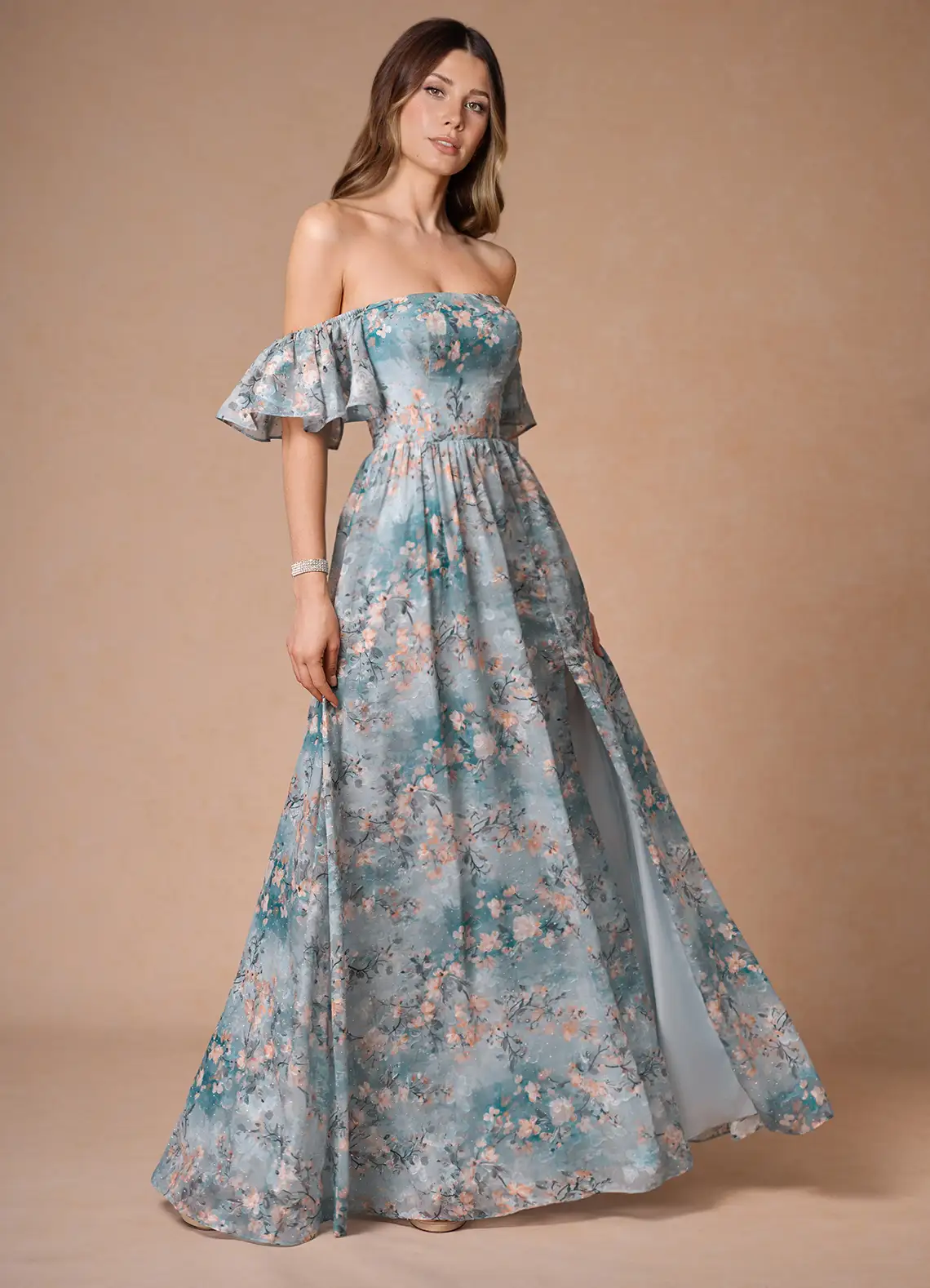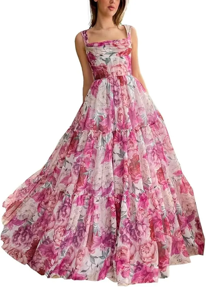 For women, a “Garden Party Black Tie” dress code calls for floor-length gowns that blend formal elegance with soft, seasonal charm. This is not a casual affair—short cocktail dresses and daywear won’t meet the black tie requirement—but the garden party element does allow for lighter colors, delicate prints, and airy fabrics that nod to spring or summer.
