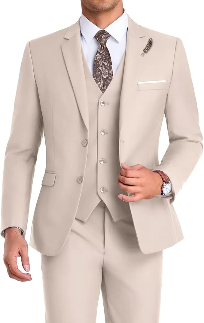 - A deep green, navy, beige, or muted burgundy tux/suit