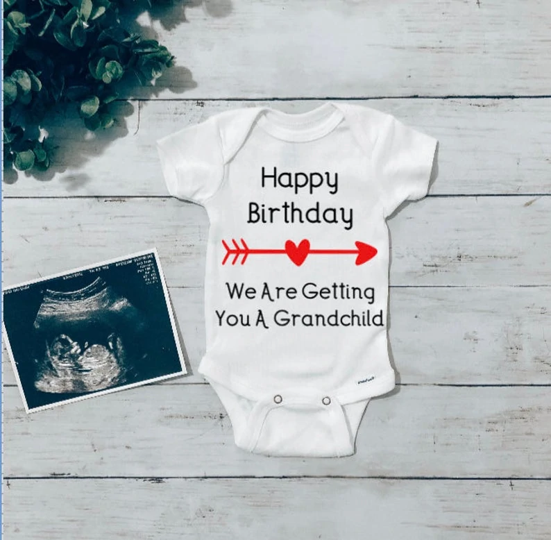 If a parent is having a birthday soon and you can hold off telling them until the birthday, then you could give them this awesome happy birthday onesie. There is no better present than a grandchild!