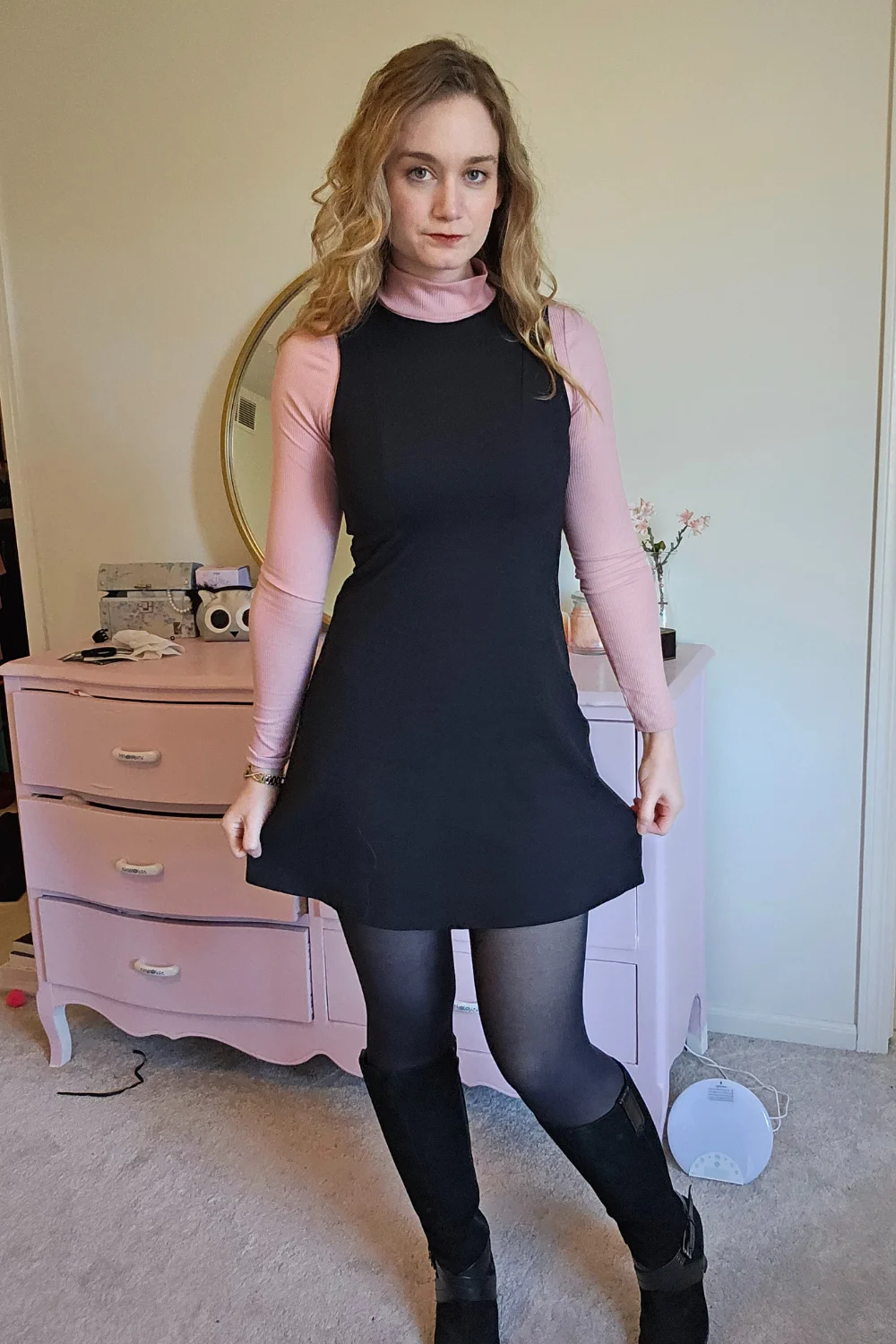 Okay, picture this: you’ve got a sleeveless dress that you love but can never figure out how to wear in cooler weather. Enter the turtleneck. In the first picture, I layered a fitted pink turtleneck under a black sleeveless dress, added sheer tights, and threw on some knee-high boots. Boom—suddenly that dress is cozy, chic, and totally winter-appropriate.
