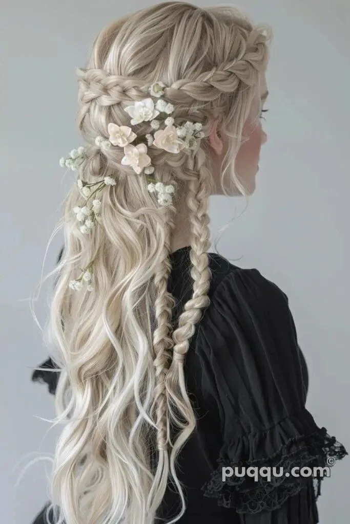 - Hair adorned with pearls, gold wire, ribbons, or flowers